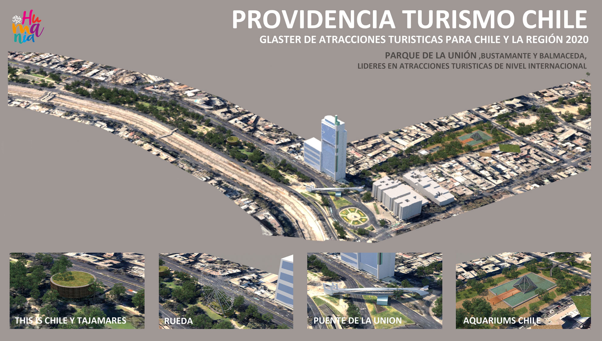 Nuestra Propuesta: Cluster de  tres atracciones que permitieran conocer Chile de diversas formas, estas son un Fly Thatre ( Un teatro de alta tecnología que permite a los espectadores quedar suspendidos en sus asientos y con la censación de volar recorrer en imágenes de alta resolución todo Chile, hasta sintiendo aromas de acuerdo a las imágenes e incorporando en animaciones 3D imagines de nuestra historia)  , Chile Aquariums, y la rueda observación, Chile Eye (Que en su recorrido de 24 minutos puede contar la historia de Chile en su casco histórico.