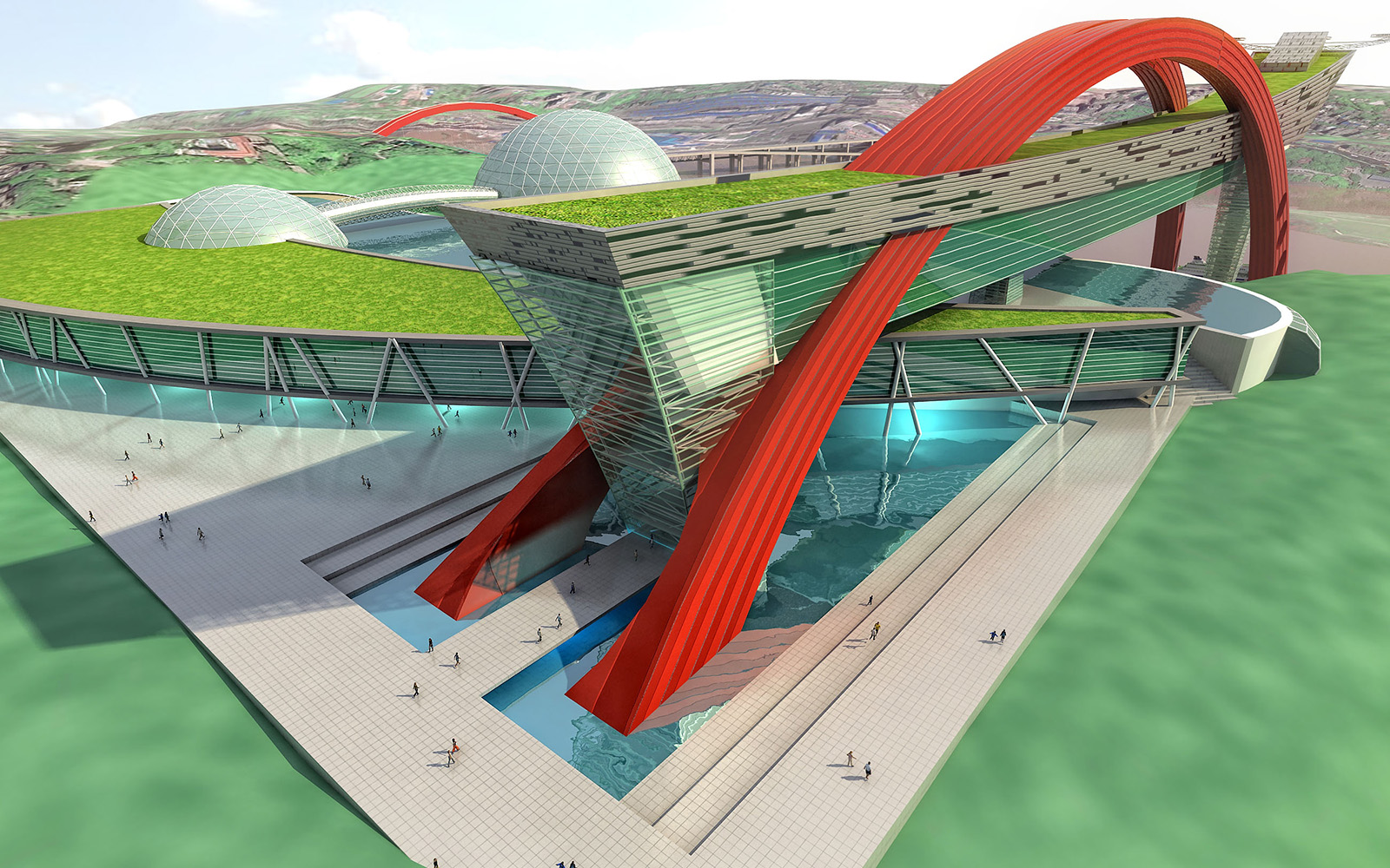 Nuestra Propuesta: Cluster de nivel internacional, muy innovador donde se integren distintos espacios físicos que capten el interés del grupo familiar y fomenten el acercamientos al deporte tradicional y no tradicional ( Fosa Buceo, Sky Diving) , la entretención ( Indoor Water Park), la comida sana (restaurantes temáticos), la naturaleza ( con Selva viva y Aquariums), la cultura ( Teatro, Court Central multipropósito, salas IMAX) y el turismo es decir un lugar que le compitiera al cáncer de los mall . Además, incorporaba, celdillas de práctica, canchas deportivas, mini golf retro iluminado, artes marciales, gimnasia etc.